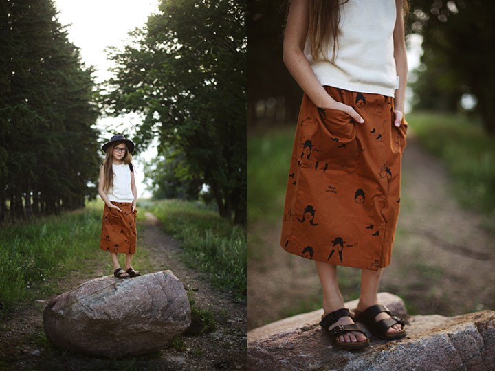i always find august to be a bit bittersweet — on the one hand, summer break is half over and back to school and the end of carefree summer days are drawing nearer, but on the other… it’s time for fall fashion! if i had to pick just one season to dress myself and the kids for all year round, it would most definitely be fall. the warm, rich tones, the layers, the texture, i love it all, and when we saw the goodies that erinn was bringing in from tiny cottons for the season, lila and i got more than a little excited. lila chose a couple of her favourite pieces from the line for these photos and i really really wish they came in my size — there is so much to love about both the fringe knit vest with its soft merino wool and fringed shoulder detail, and the dolls button down skirt with its gorgeous rust colour, sweet illustrations, roomy pockets(!) and snaps up the front.